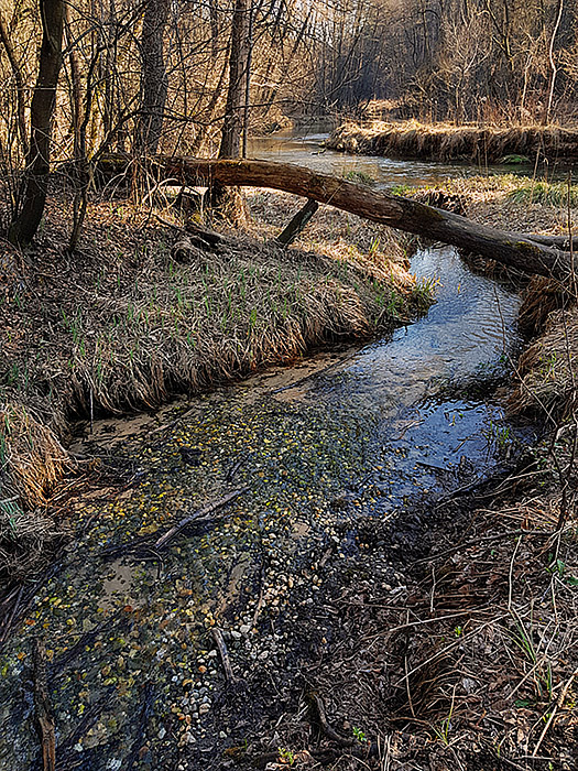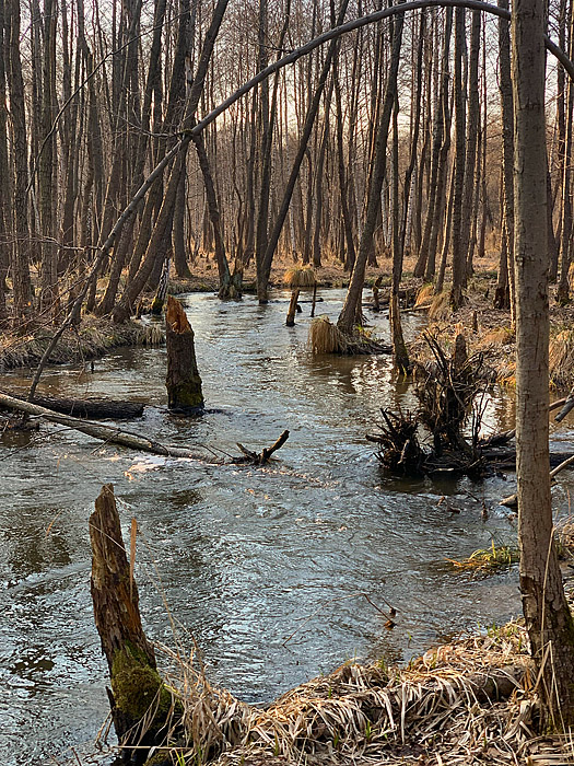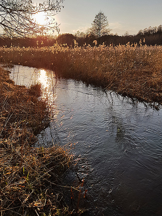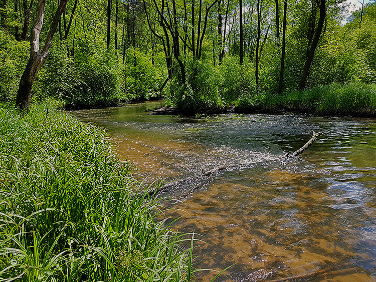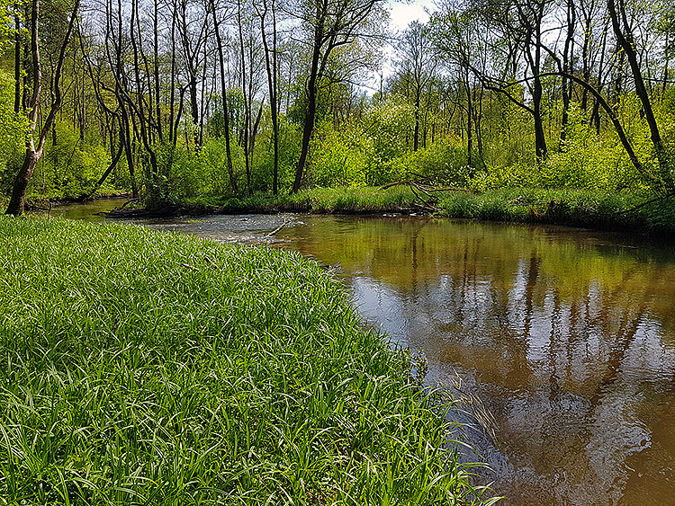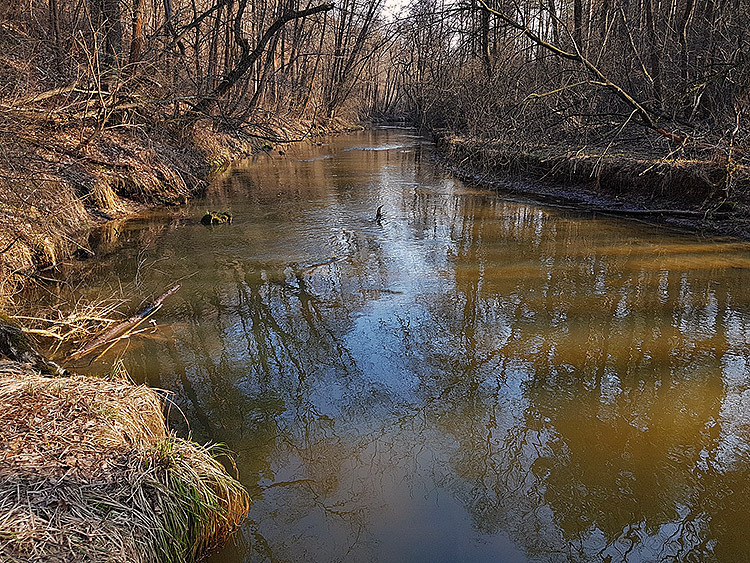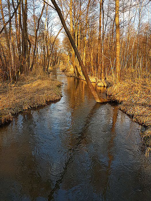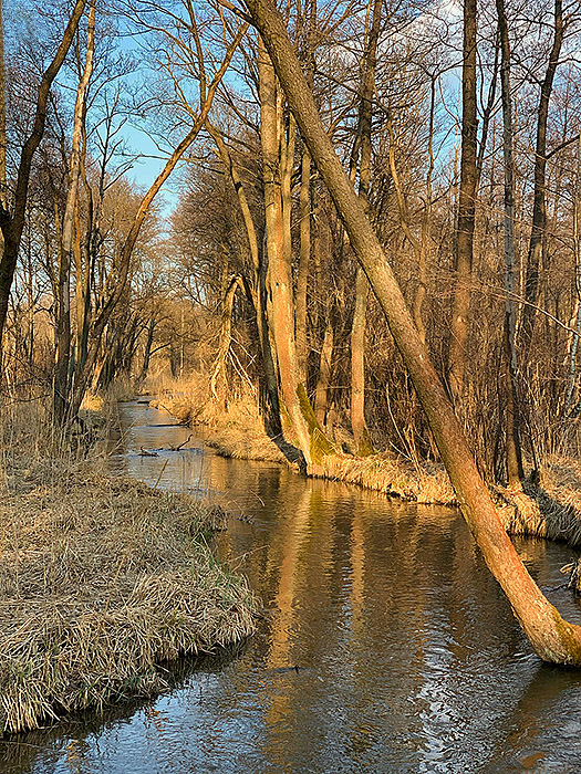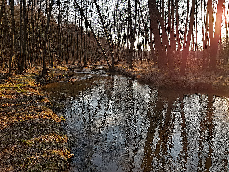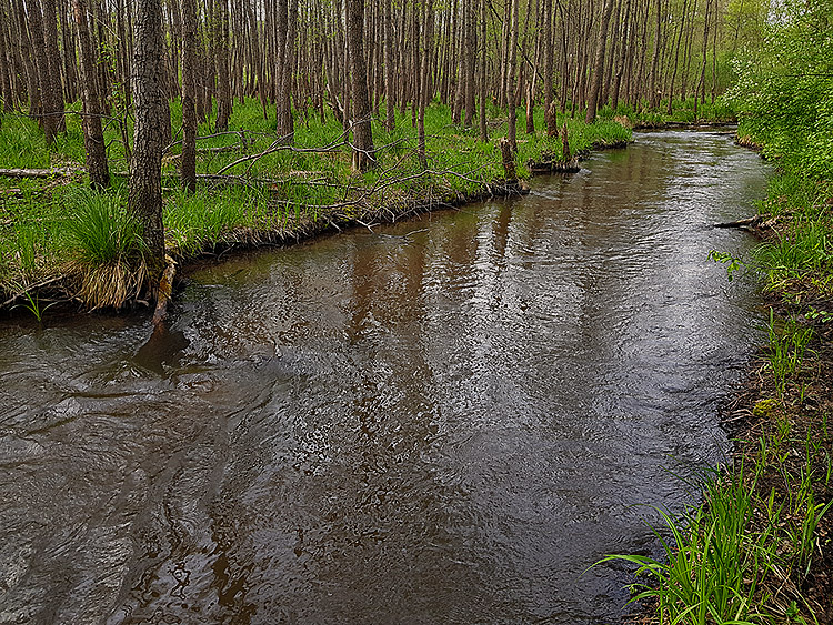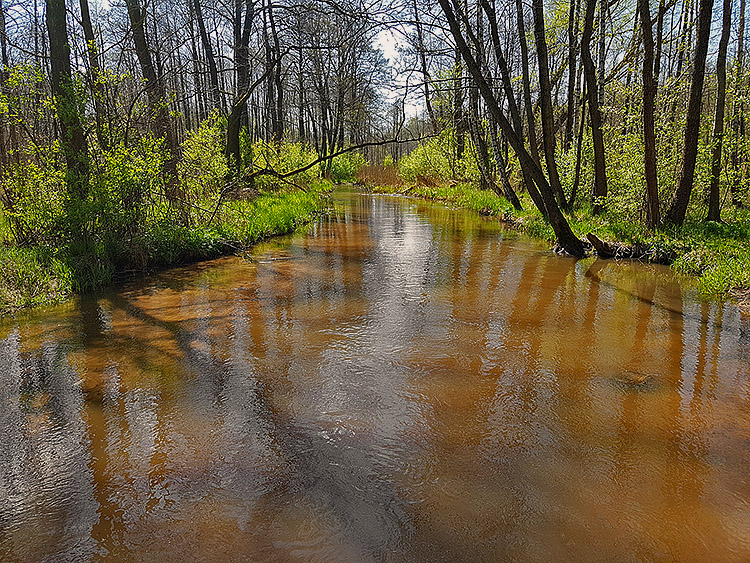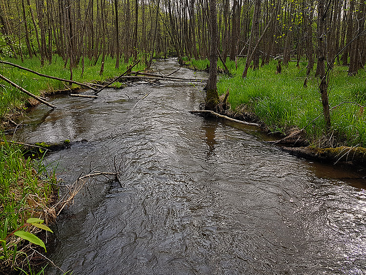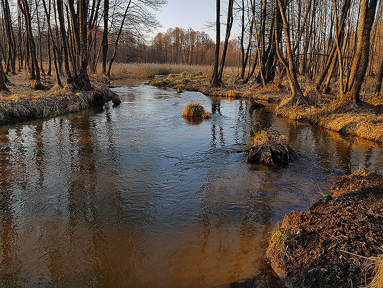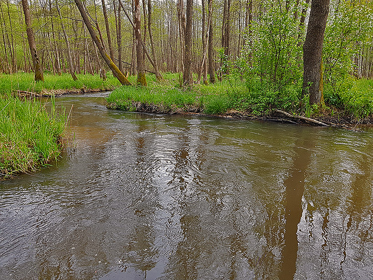 Bieg rzeki jest zróżnicowany i miejscami bardzo malowniczy. Na wielu odcinkach tworzy ona liczne odnogi i zakola, typowe dla rzek o naturalnym, w niewielkim stopniu uregulowanym korycie. Występują tu także meandry, rozlewiska oraz obszary podmokłe, sprzyjające rozwojowi bogatej roślinności wodnej i błotnej. W niektórych miejscach spotkać można niewielkie, naturalne stawy, które dodatkowo urozmaicają krajobraz doliny rzecznej.