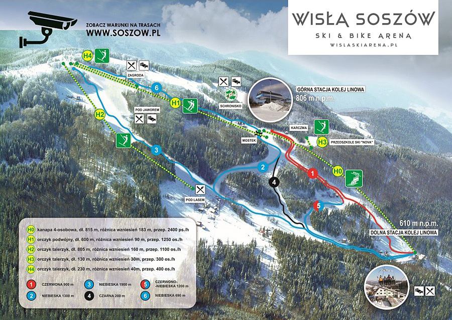 | Nazwa: Wisła Ski Arena Soszów. Adres: ul. Cieślarów 30, 43-460 Wisła. Wyciągi: 1 szybka kanapa 4-osobowa (2 400 os/h), 1 orczyk (1250 os/h) i 2 talerzyki do nauki. Ilość tras narciarskich: 1 czarna, 1 czerwona i 4 niebieskie. Wysokość n.p.m: 874 m. Różnica wysokości: 263 m. Całkowita długość wszystkich tras zjazdowych: 6,2 km. Najdłuższa trasa: 1,9 km. Trasy naśnieżane: Tak. Trasy podświetlane: Tak. Moja ocena ośrodka narciarskiego: 7 / 10